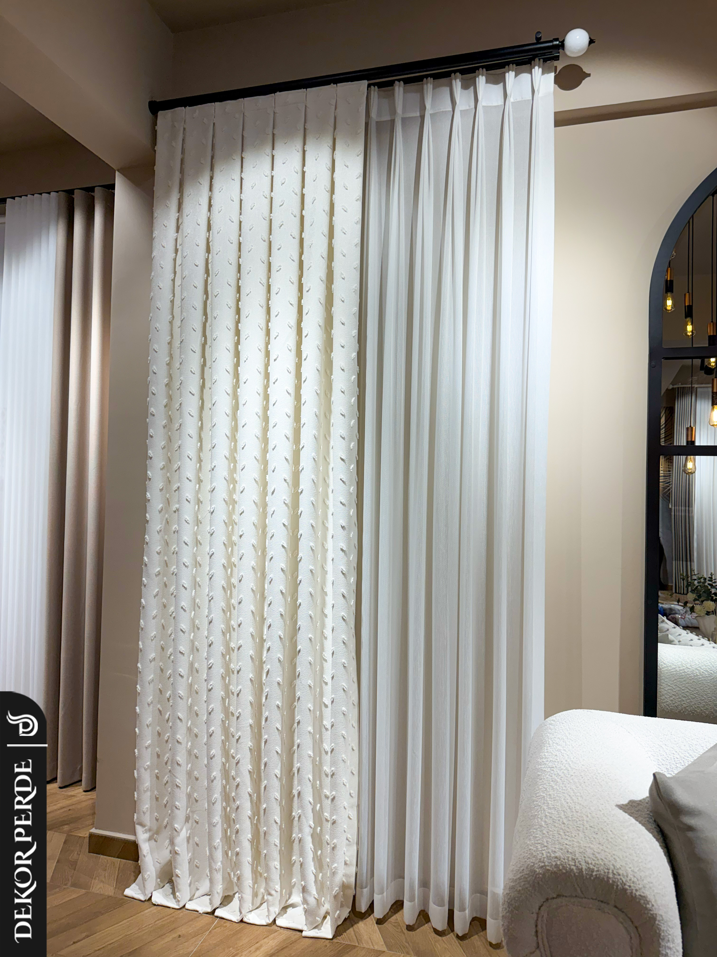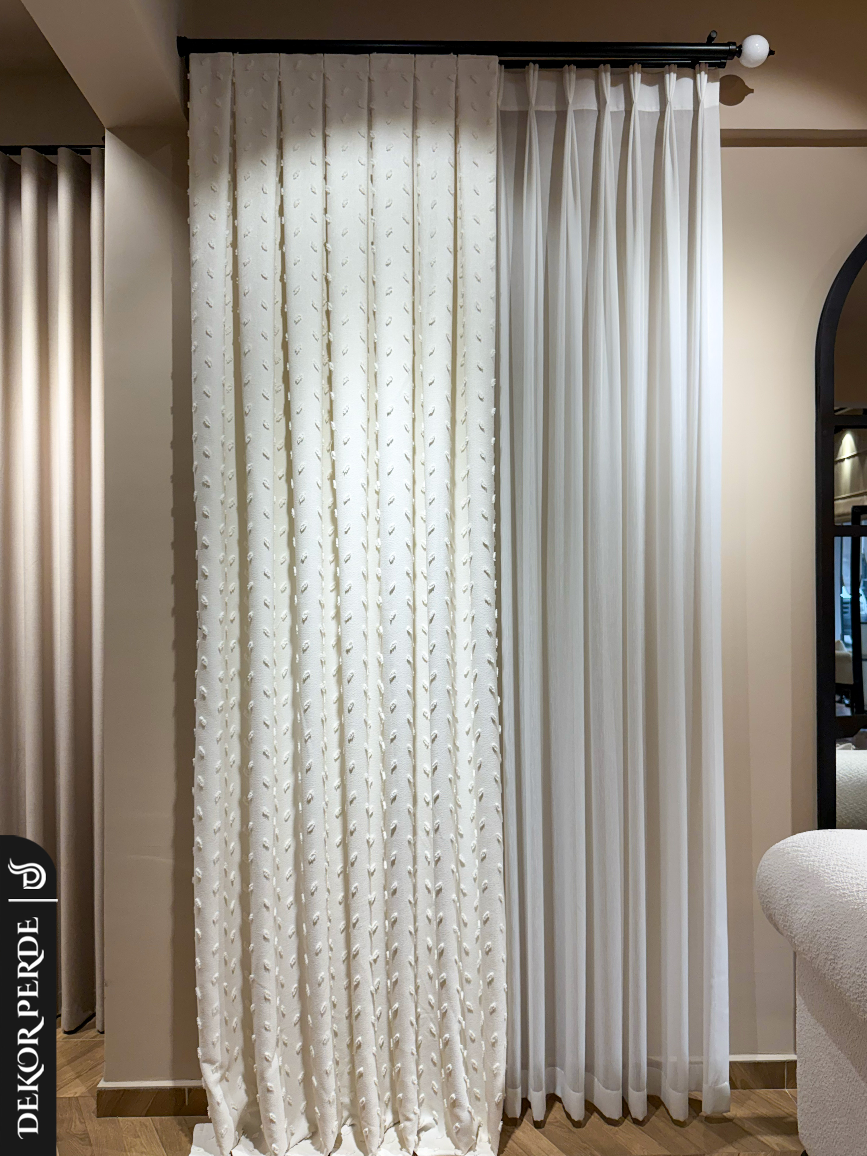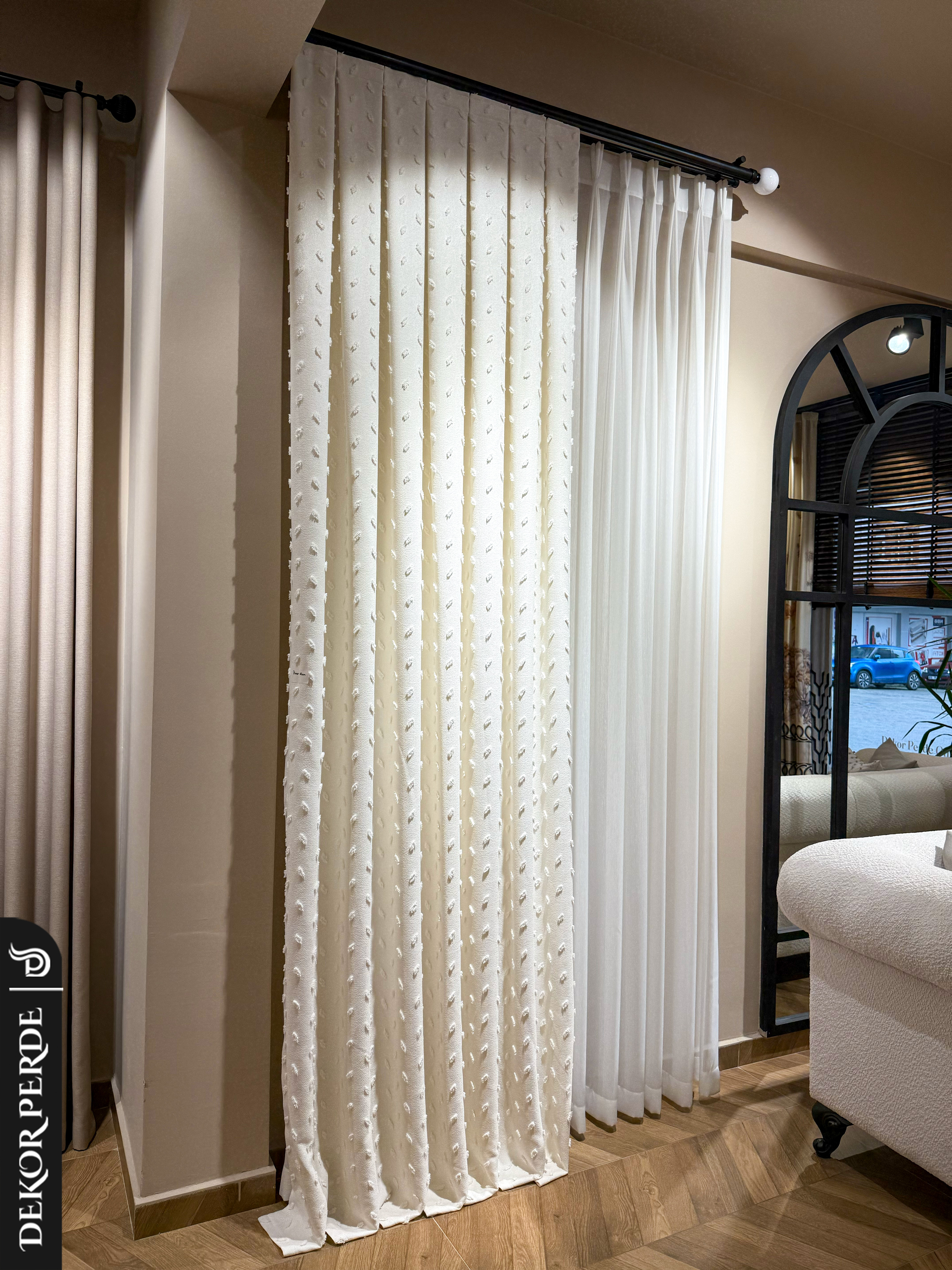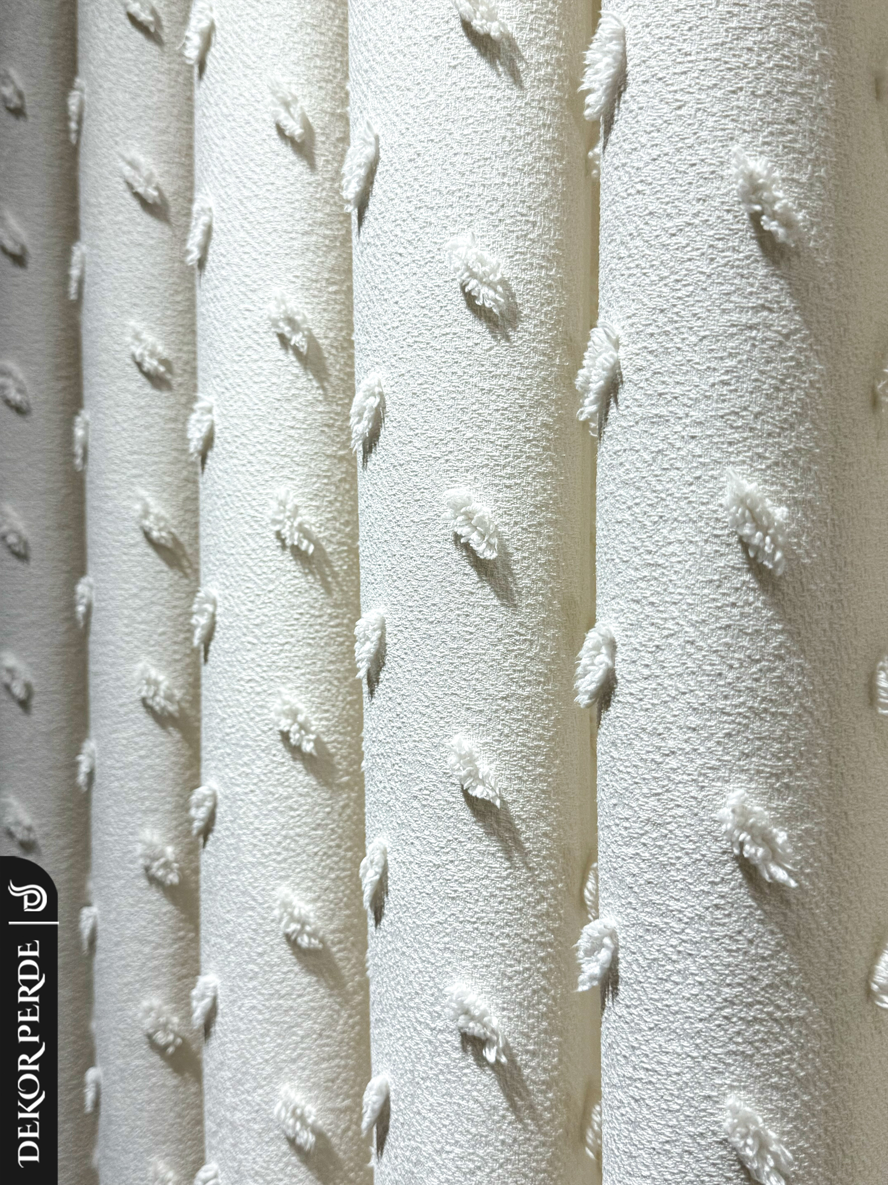 -Püsküllü Puantiyeli Damlalı Keten Fon Perde